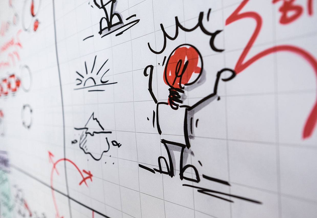 Inhalte, Prozesse und Dynamiken werden so festgehalten, dass neben der linken Gehirnhälfte (Zahlen, Daten, Fakten) auch unsere rechte (Emotionen, Intuition, Farben, Bilder) mitdenken kann. Bunte Post-its, Flipcharts und Metaplanwände sind charakteristisch für Visual Facilitation. Sie bieten Flexibilität und Spielraum in dynamischen Workshops für neue Lösungen.